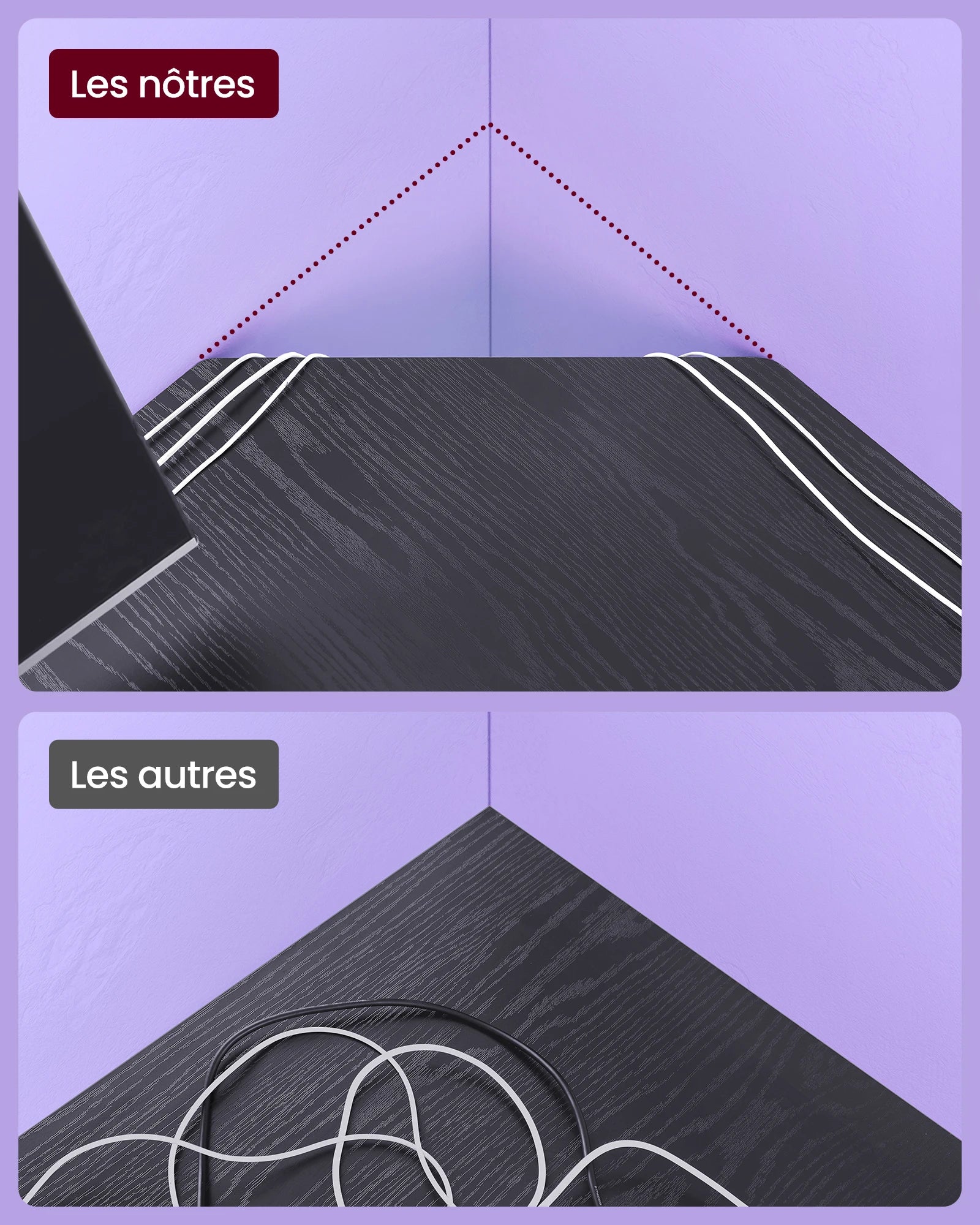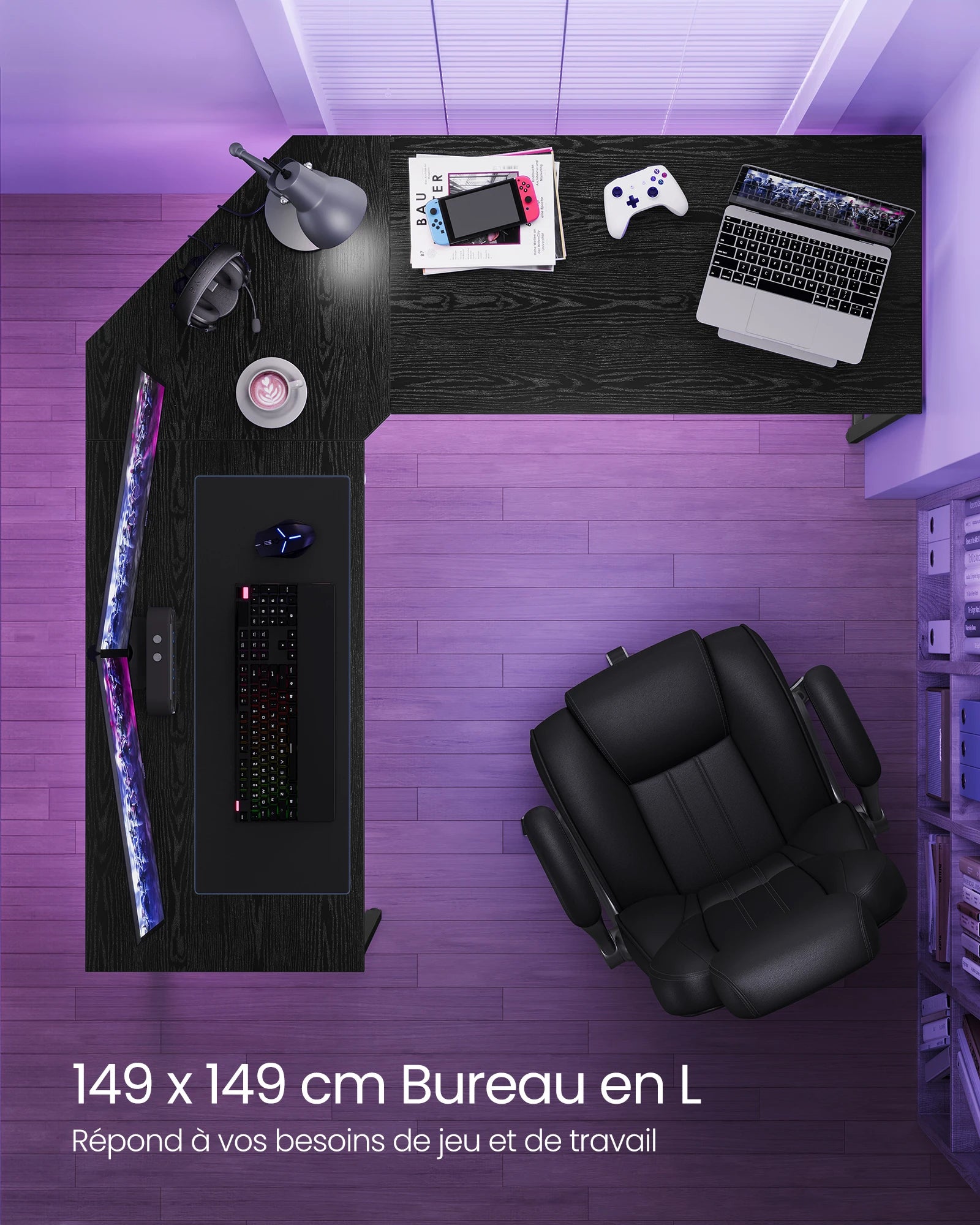 Avec son grand plateau segmenté, ses passages de câbles intégrés et ses supports dédiés, le bureau d’angle gaming permet une gestion parfaite de vos équipements : écran, tour, casque, clavier, etc. Il favorise une posture ergonomique et une liberté de mouvement totale.